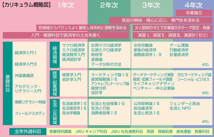 「経済学」の基礎にはじまり、金融・政策・国際といった応用、「経営・起業」に関わる会計・マーケティング・経営戦略、「生活、公共性」に関する家計と社会保障までの専門知識や統計的手法を活用しながら、様々な経済的・社会的課題を論理的かつ批判的に分析する能力の修得をめざす。