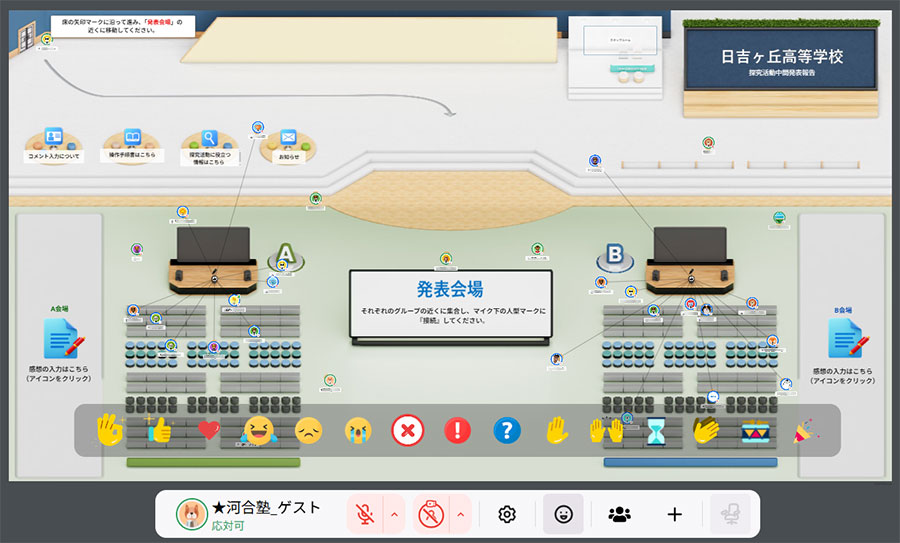 この度、このメタバース空間にて、京都市立日吉ケ丘高等学校の授業「情報演習」の中間発表会を実施しました。発表会は、同校の情報科教諭である藤岡健史先生にご協力いただき、河合塾のスタッフも参加して行われました。